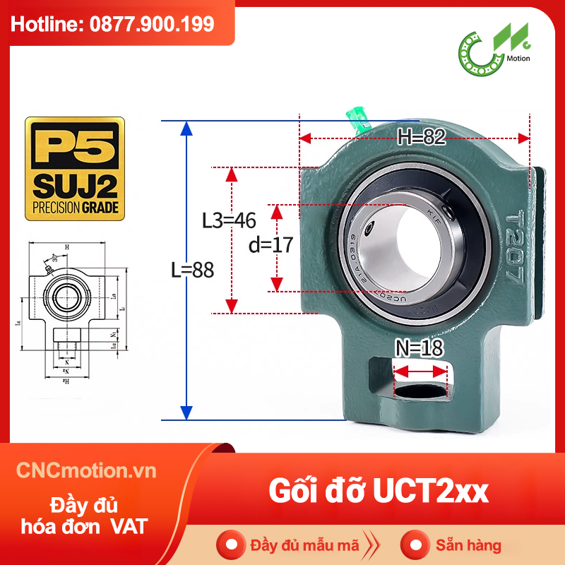 bao phủ dải mã bạn cung cấp: UCP201–220, UCP305–320, UCF203–208, UCF305–320, UCFC204–212, UCFL204–212, UCPA204–212, UCT204–212, UC204–220, UC305–320, SUCP204–215, SUCF204–215, SUCFL204–215, SUCT204–215, SUC201–210. Gửi mã/đường kính trục để CNC Motion đề xuất model, vật liệu và kiểu phớt phù hợp. Dòng 305–320 dùng thân lớn, gân tăng cứng – phù hợp tải nặng, xung lực. Ổ chèn UC dùng thay thế vào các vỏ P/F/FL/FC/T… hoặc lắp riêng theo thiết kế. Biến thể inox dùng thân & ổ chèn thép không gỉ, phớt phù hợp vệ sinh – thích hợp chế biến thực phẩm, dược phẩm, ngoài trời, môi trường ẩm/ăn mòn. Lưu ý: Kích thước lỗ bắt, bước lỗ, kích thước thân có thể khác giữa các hãng. Hãy gửi mã/ứng dụng để được đề xuất đúng model.Gối đỡ vòng bi UC & SUC | UCP • UCF • UCFL • UCFC • UCT • UCPA • UC | Dải mã 201–220 & 305–320 | Inox SUC-series | CNC Motion