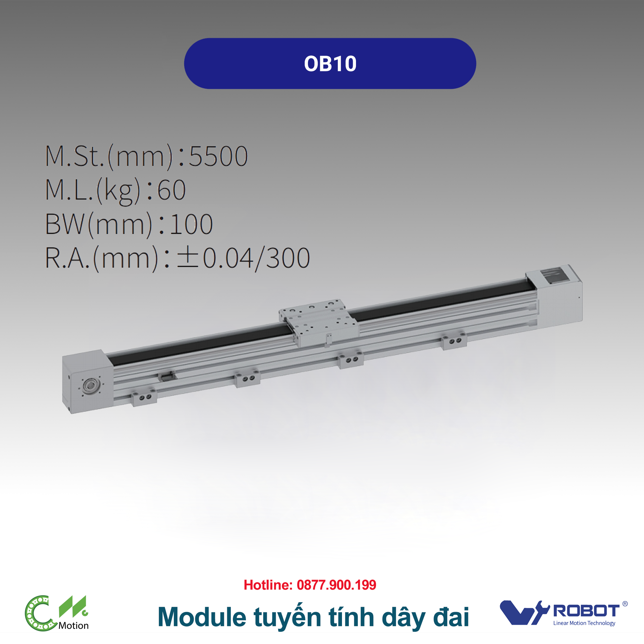 Đại lý W-Robot tại Việt Nam – CNC Motion: hỗ trợ kỹ thuật, lựa chọn model, báo giá nhanh. *Giá trị tải theo hướng ngang; trục dọc cần cân nhắc phanh/đối trọng. Hiệu năng thực tế phụ thuộc profile tăng/giảm tốc, quán tính tải, cách gá và môi trường. *Chọn model theo tải/độ cứng, hành trình và quán tính gá lắp. Kiểm chứng bằng tính toán động lực học & thử nghiệm FAT. *Vui lòng đối chiếu catalog mới nhất để map đúng mã coupler/cảm biến theo thương hiệu servo.OB Series – Module tuyến tính truyền dây đai răng tốc độ cao, hành trình siêu dài tới 5.5 m