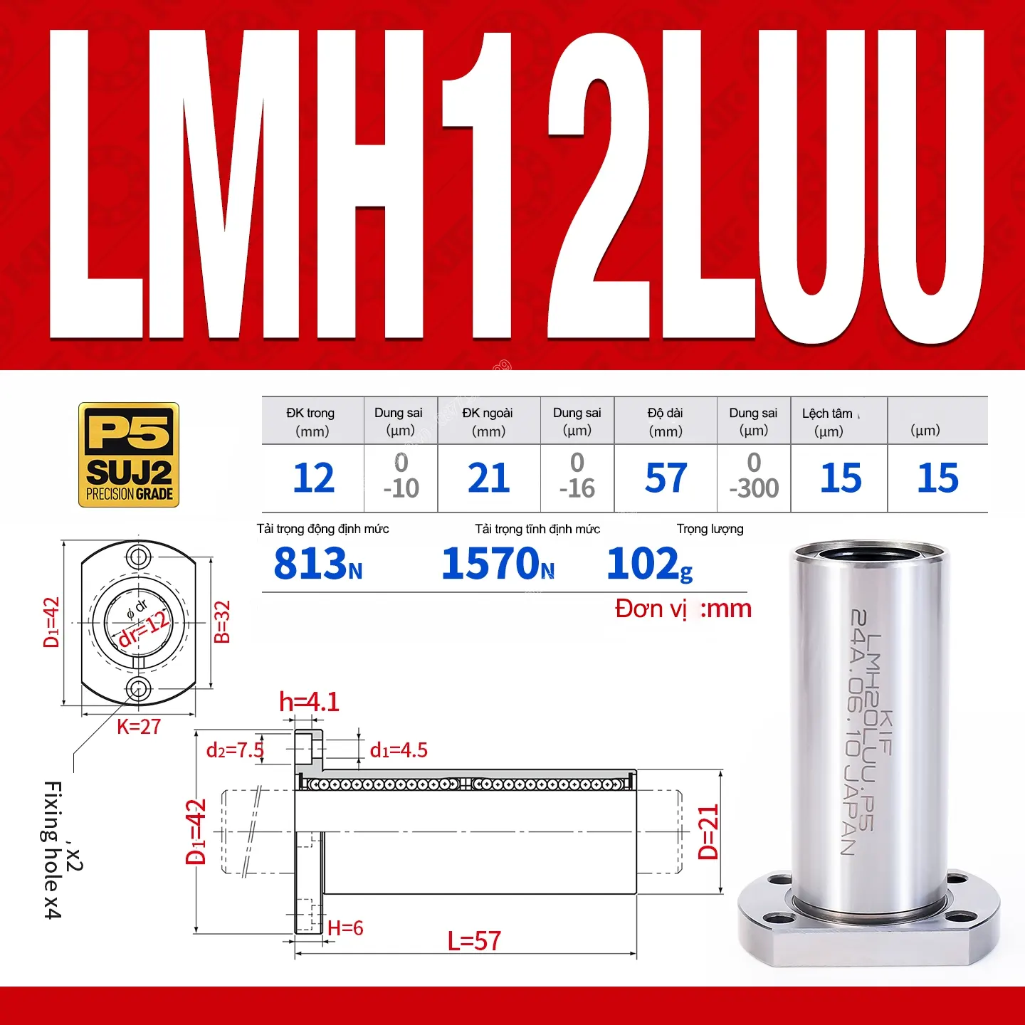 LMH-LUU (long type) – bản dài của LMH-UU, tăng khả năng chịu tải & độ bền, phù hợp hành trình dài trong CNC, tự động hóa.