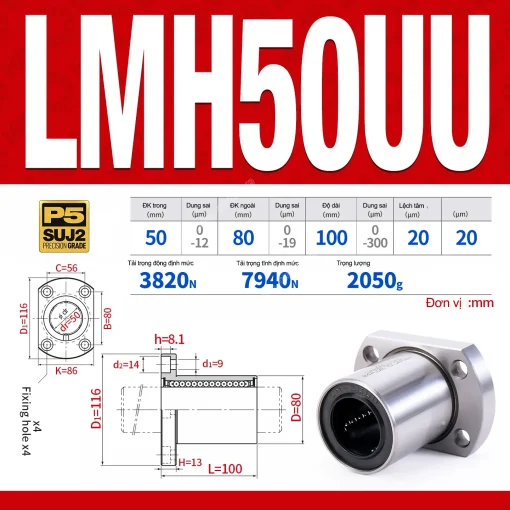 Con trượt tròn mặt bích Oval thân ngắn LMH50UU (Bi trượt tròn)