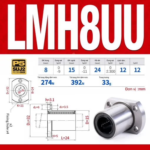 LMH-UU bạc trượt bi tuyến tính mặt bích oval 2 lỗ (H-Flange), gọn, tối ưu không gian hẹp, lắp đặt nhanh.