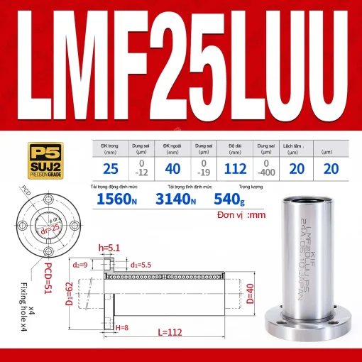 Con trượt tròn mặt bích tròn thân dài LMF25LUU (Bi trượt tròn)