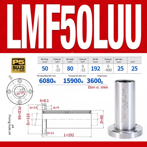 Con trượt tròn mặt bích tròn thân dài LMF50LUU (Bi trượt tròn)