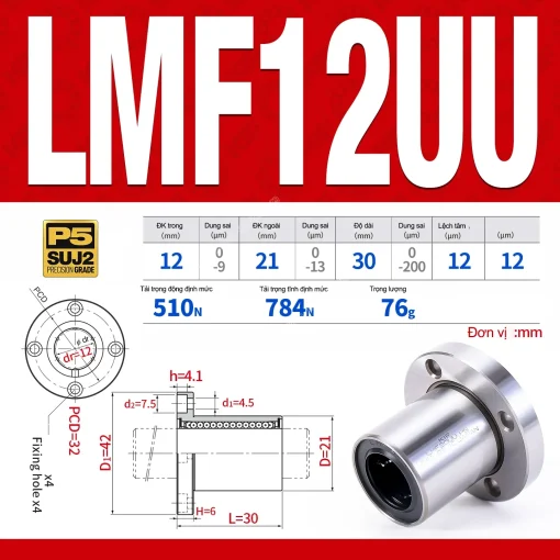 Con trượt tròn mặt bích tròn thân ngắn LMF12UU (Bi trượt tròn)