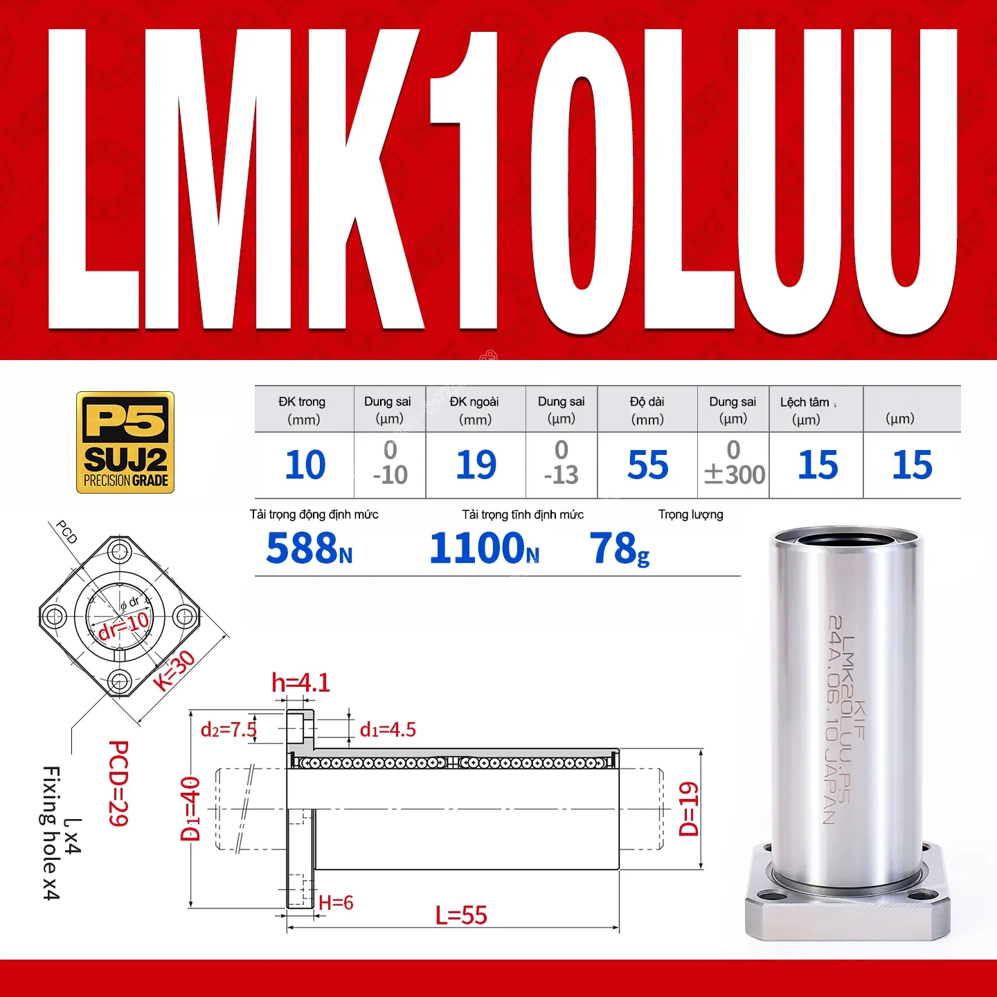 Con trượt tròn mặt bích vuông thân ngắn LMK10UU (Bi trượt tròn)