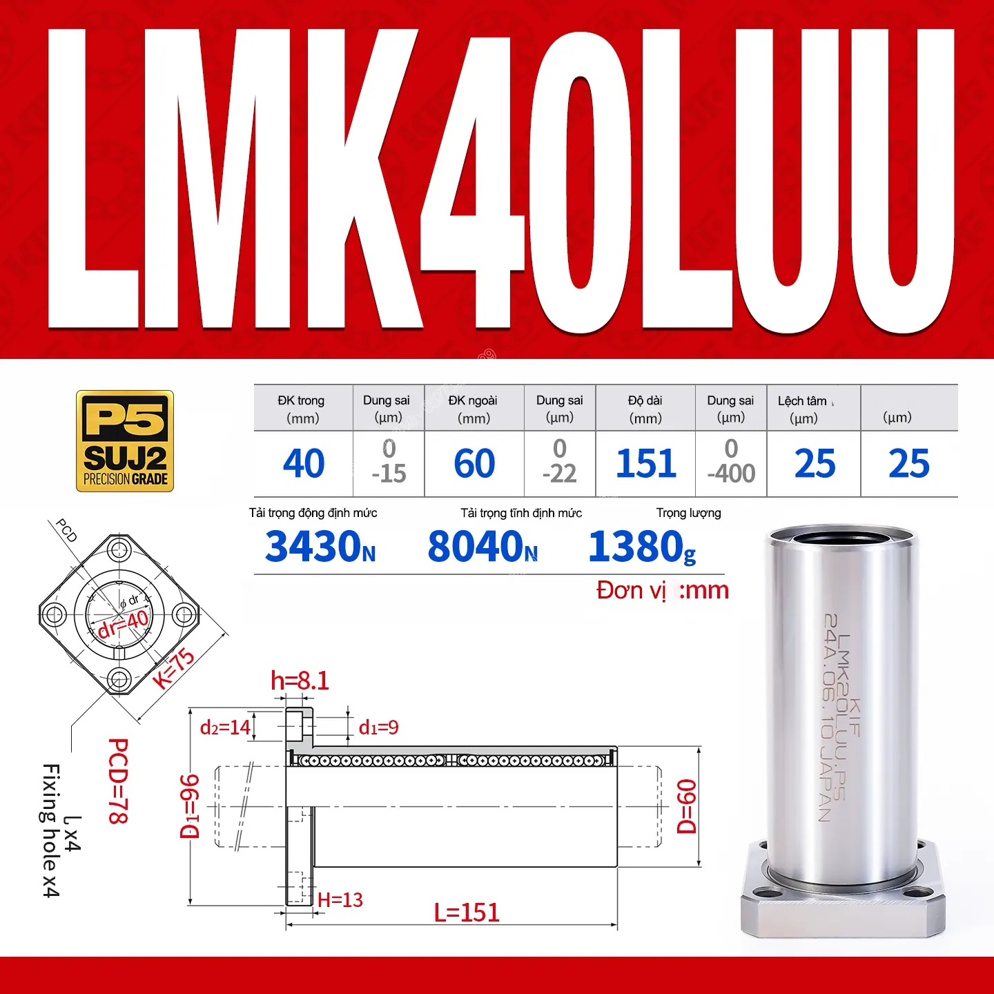 Con trượt tròn mặt bích vuông thân ngắn LMK40UU (Bi trượt tròn)