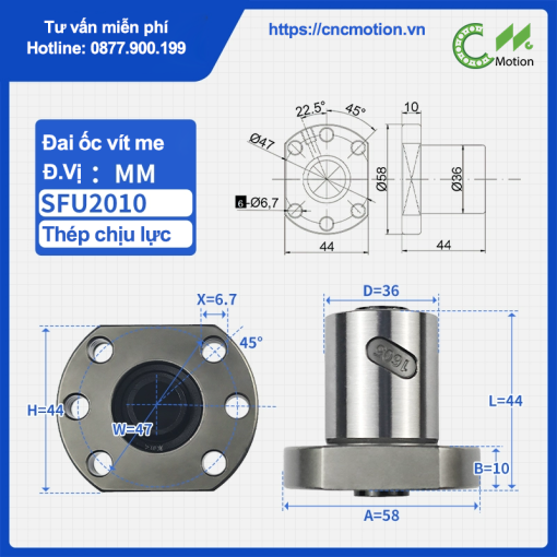 Website: cncmotion.vn • Hỗ trợ kỹ thuật & báo giá nhanh. *Thông số tham khảo; có thể thay đổi theo từng hãng. Vui lòng đối chiếu catalog trước khi đặt hàng. Ngoài ra có thể đặt theo chiều dài tùy chỉnh, preload (C0, C1, C2...), hoặc vật liệu đặc biệt chống gỉ.Trục vít me SFU – Ball Screw độ chính xác cao cho máy CNC