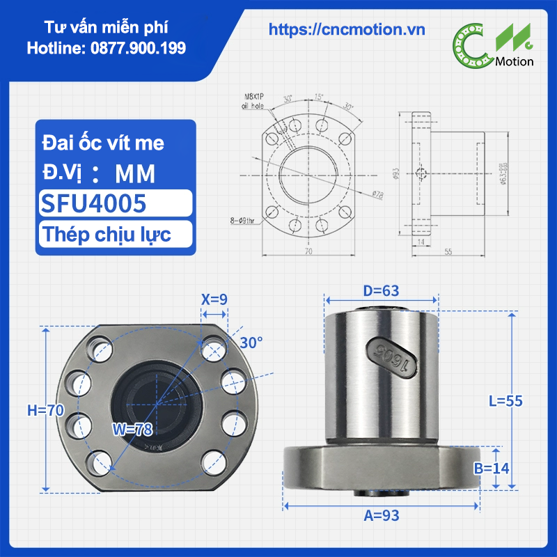 Website: cncmotion.vn • Hỗ trợ kỹ thuật & báo giá nhanh. *Thông số tham khảo; có thể thay đổi theo từng hãng. Vui lòng đối chiếu catalog trước khi đặt hàng. Ngoài ra có thể đặt theo chiều dài tùy chỉnh, preload (C0, C1, C2...), hoặc vật liệu đặc biệt chống gỉ.Trục vít me SFU – Ball Screw độ chính xác cao cho máy CNC