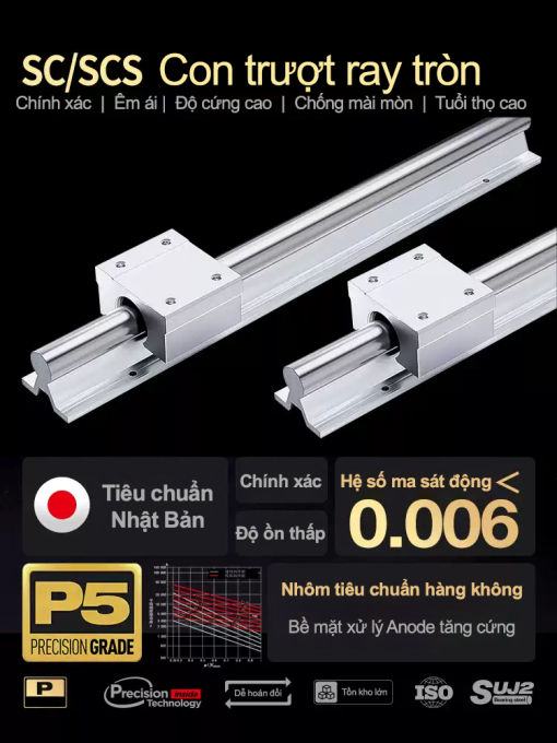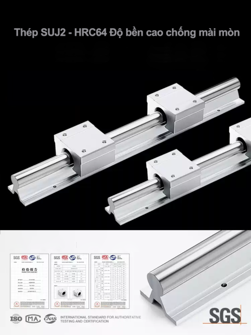 Ray SBR có thiết kế supported rail (có đế nhôm), giúp chống võng khi ray dài, tải lớn. So với ray tròn trơn, SBR có độ cứng vững và độ ổn định cao, phù hợp cho cả CNC DIY và công nghiệp.
