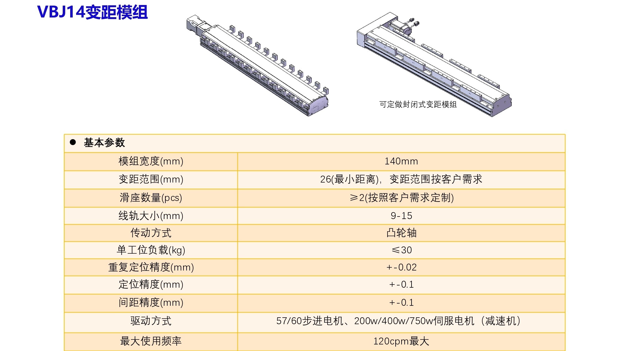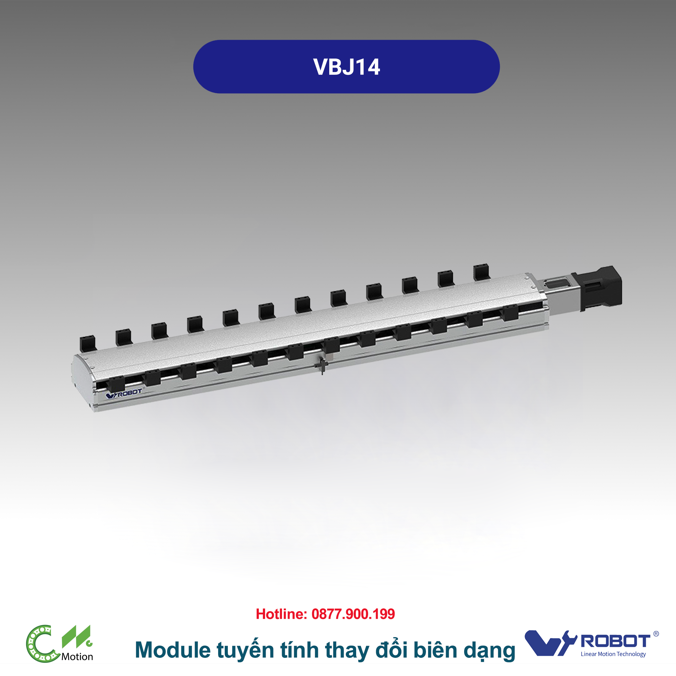 CNC Motion Việt Nam – Đại lý W-Robot: tư vấn bài toán chia khoảng, đồng bộ đa trục, thiết kế – lắp đặt trọn gói. *Số bàn trượt tiêu chuẩn; có thể tùy biến theo yêu cầu. **Dải pitch (khoảng cách) mang tính tham chiếu, phụ thuộc kích cỡ sản phẩm, đồ gá và cấu hình servo. Phù hợp bao bì, FMCG – tạo pitch nhanh trước khi vào máy dán nhãn/đếm/kiểm. Luôn dùng chặn cơ khí hai đầu, giới hạn mềm trong PLC/drive và E-stop ở vị trí thuận tiện.VBJ Series – Module tuyến tính thay đổi biên dạng (Variable Pitch) cho dây chuyền tự động hóa linh hoạt