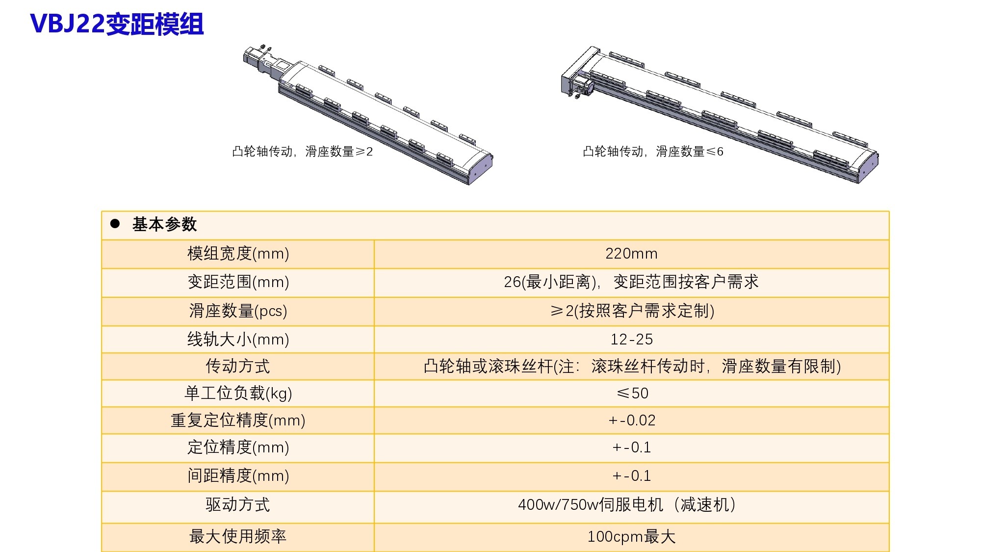 Trái với các module tuyến tính tiêu chuẩn chỉ có một bàn trượt và pitch cố định, VBJ tích hợp nhiều bàn trượt đồng bộ hoặc độc lập, cho phép điều chỉnh khoảng cách động (variable pitch) trong quá trình chuyển động. Cơ cấu lõi là thanh răng & bánh răng (rack & pinion) kết hợp các khối cam/đồng bộ và thuật toán điều khiển giúp chuyển đổi biên dạng “đội hình” nhịp nhàng, êm và chính xác.