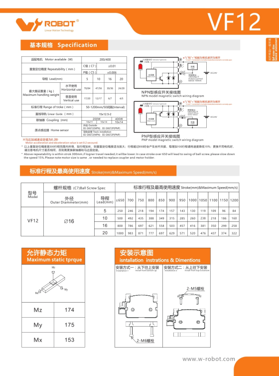 Website: cncmotion.vn • Đại lý W-Robot Việt Nam – tư vấn kỹ thuật & báo giá nhanh. *Thông số có thể thay đổi theo cấu hình lead, công suất motor, gá đặt và môi trường làm việc. Dưới đây là tốc độ tối đa (mm/s) theo lead và stroke. Với stroke > 650 mm, nên giảm ~15% tốc độ để hạn chế dao động trục vít. *Giá trị tham chiếu theo bảng “Stroke & Maximum Speed” của VF6N. *Giá trị headline theo trang sản phẩm của hãng; thông số vận hành thực tế phụ thuộc lead, tốc độ, bố trí và đồ gá. Ví dụ: Kết luận: VF Series là lựa chọn tối ưu khi cần độ chính xác cao, linh hoạt điều khiển và độ bền chu kỳ; khí nén chỉ phù hợp các thao tác đơn giản, không yêu cầu định vị chính xác.Module tuyến tính VF Series – Ball Screw Linear Actuator chống xoắn, cấu hình hoàn chỉnh