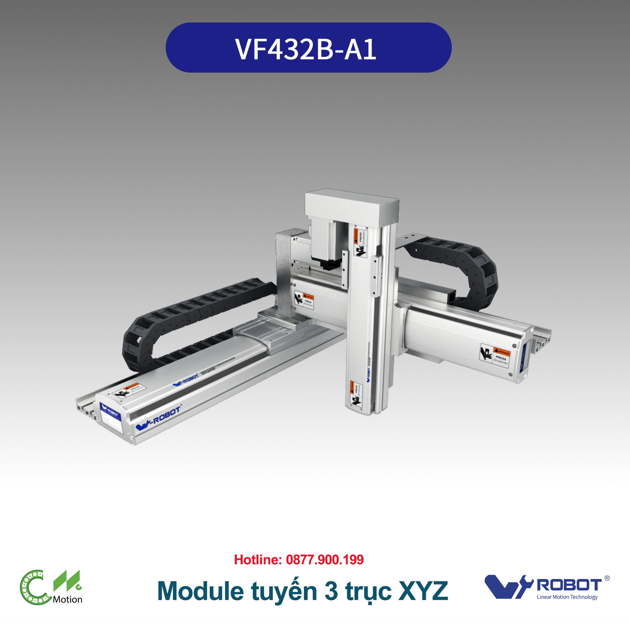 CNC Motion Việt Nam – Đại lý W-Robot: cung cấp bộ XYZ lắp sẵn, tùy biến hành trình, bàn gá, EOAT và tủ điều khiển theo yêu cầu. *Hành trình/tốc độ là giá trị tham chiếu từ datasheet minh hoạ; có thể tùy biến theo yêu cầu. **Tải phụ thuộc hành trình, tốc độ, EOAT và độ cứng gá đặt. Phiên bản tối ưu cho không gian hẹp, phù hợp dán nhãn – cấp liệu – pick & place tốc độ cao với EOAT nhẹ. Hành trình/tốc độ tương đương nhóm nhỏ (X~800, Y~300, Z~100 mm; X/Y~800 mm/s; Z~500 mm/s). Luôn sử dụng chặn cơ khí hai đầu và giới hạn mềm trong PLC/drive; trục Z bắt buộc có phanh cho chế độ an toàn khi mất điện.VF Series – Bộ truyền động tuyến tính 3 trục XYZ, chuẩn công nghiệp, dựng sẵn khung & cáp kéo