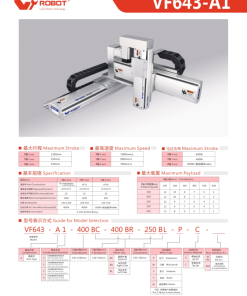 VF Series kết hợp 3 trục X–Y–Z theo dạng gantry (cổng) hoặc tháp Z trung tâm, sử dụng vít me bi (ball screw) dẫn động cùng ray trượt tuyến tính đảm bảo độ cứng – chính xác. Toàn bộ bộ cơ khí đã tích hợp sẵn cáp kéo (cable chain), giá bắt servo, cảm biến Home/Limit, và mặt bích chuẩn cho EOAT/Gripper, giúp rút ngắn thời gian thiết kế – lắp đặt.