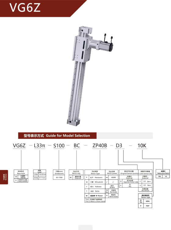 Thân nhôm đùn cứng vững kết hợp ray dẫn hướng tuyến tính bảo đảm độ thẳng, độ cứng và tuổi thọ trong môi trường công nghiệp. Bàn trượt có mặt bích lỗ ren chuẩn để bắt gripper/EOAT, đồ gá, đầu cắt… Các model VG tương thích servo đa chuẩn (Panasonic, Mitsubishi, Yaskawa, Delta…), linh hoạt cấu hình moter trái/phải và cảm biến NPN/PNP cho Home/Limit.