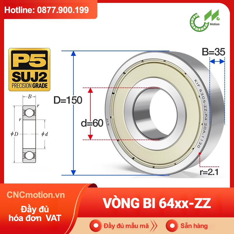 Trong khi đó, 68xx–69xx là nhóm mỏng/siêu mỏng, tối ưu cho tốc độ & không gian hẹp. Dòng 62xx là lựa chọn đa dụng, cân bằng giữa kích thước – tải – tốc độ. Kích thước dưới đây theo chuẩn phổ biến (mm). Cột Cr/C0 (kN) là giá trị tham khảo phụ thuộc hãng, vật liệu, cấp chính xác, mỡ bôi trơn… (vui lòng đối chiếu catalog thực tế khi đặt hàng). *Giá trị Cr/C0 là phạm vi tham khảo, không dùng để tính chọn cuối cùng. Vui lòng tra catalog của hãng bạn sử dụng. Dòng 63xx có vỏ dày, bi lớn → chịu tải cao hơn 62xx ở cùng đường kính trục. Phù hợp máy cơ khí, công nghiệp nặng. Dòng 64xx có kích thước lớn, chịu tải rất cao, dành cho ứng dụng công nghiệp nặng và motor công suất lớn. Dòng 68xx là siêu mỏng: quán tính thấp, RPM rất cao, phù hợp không gian hẹp và cụm quay nhẹ. Dòng 69xx là mỏng vừa, đa năng hơn 68xx, vẫn giữ lợi thế tốc độ cao, thích hợp motor nhỏ/thiết bị dân dụng và công nghiệp nhẹ. *Cr/C0 thay đổi theo hãng, cấp chính xác (P0…P5), kiểu cage và chất bôi trơn. Hãy tham chiếu catalog của cùng nhà sản xuất. Dụng cụ: ê tô/ống chèn đúng cỡ, thước cặp, mỡ NLGI #2, khăn sạch, cờ lê lực (khuyến nghị). Mẹo: với vỏ mỏng hoặc lắp từ mặt ngoài, chọn bản F… có bích để định vị mép nhanh, hạn chế trôi dọc trục. Lưu ý: Thông số tải Cr/C0 và tốc độ giới hạn thay đổi theo hãng/cấp chính xác/kiểu che chắn. Hãy gửi mã/ứng dụng để CNC Motion tư vấn đúng model.Vòng bi dòng 62xx – 63xx – 64xx – 68xx – 69xx | Bi rãnh sâu 1 dãy tốc độ cao – tải lớn | CNC Motion