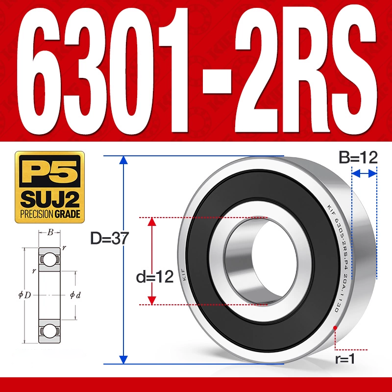 Vòng bi – bạc đạn 6301-2RS (Phớt cao su – 12*37*12 mm)