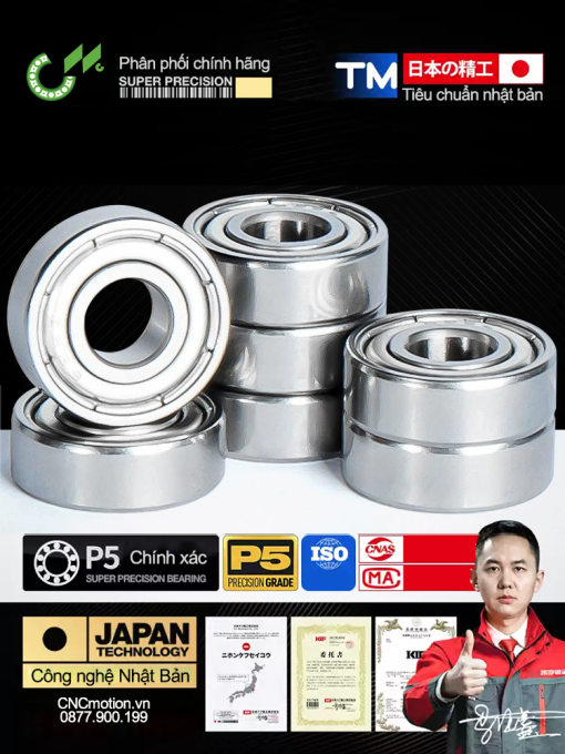 Với kích thước nhỏ–trung, các dòng 60x/62x/68x tối ưu cho cụm trục có tốc độ cao, yêu cầu độ êm và độ chính xác ổn định. Dòng 60x gồm các mã 600–609. Bảng dưới là kích thước tham khảo thường gặp (d×D×B). Biến thể: Open, ZZ, RS/2RS, S60x (inox), F60x (có bích). *Kích thước có thể khác nhau đôi chút tùy hãng. Vui lòng đối chiếu catalog/bản vẽ khi thay thế. Dòng 62x có D/B lớn hơn 60x ở cùng d → cứng vững & tải cao hơn. Bảng dưới tham khảo các mã 6200–6209. Dòng 68x có chiều rộng B mỏng, quán tính thấp → rất phù hợp tốc độ cao và nơi không gian hẹp. Bảng tham khảo 6800–6809. Dụng cụ: ê tô/ống chèn đúng cỡ, thước cặp, mỡ NLGI #2, cờ lê lực (khuyến nghị), găng tay sạch. Mẹo: nếu vỏ mỏng/lắp từ mặt ngoài, chọn bản F60x/F62x/F68x có bích chặn để định vị nhanh. Tiêu đề SEO: Vòng bi mini dòng 60x – 62x – 68x | Bi rãnh sâu 1 dãy tốc độ cao | CNC MotionVòng bi mini dòng 60x – 62x – 68x | Bi rãnh sâu 1 dãy tốc độ cao – êm – bền | CNC Motion