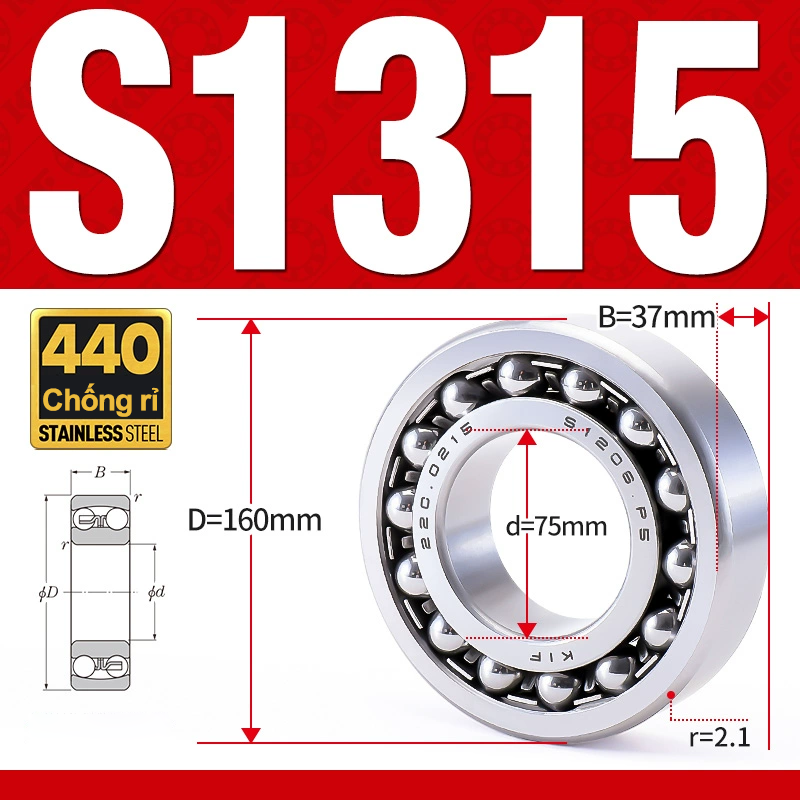 Vòng bi - bạc đạn tự lựa S1315 (Chống ăn mòn - Inox 404C - 75*160*37 mm)