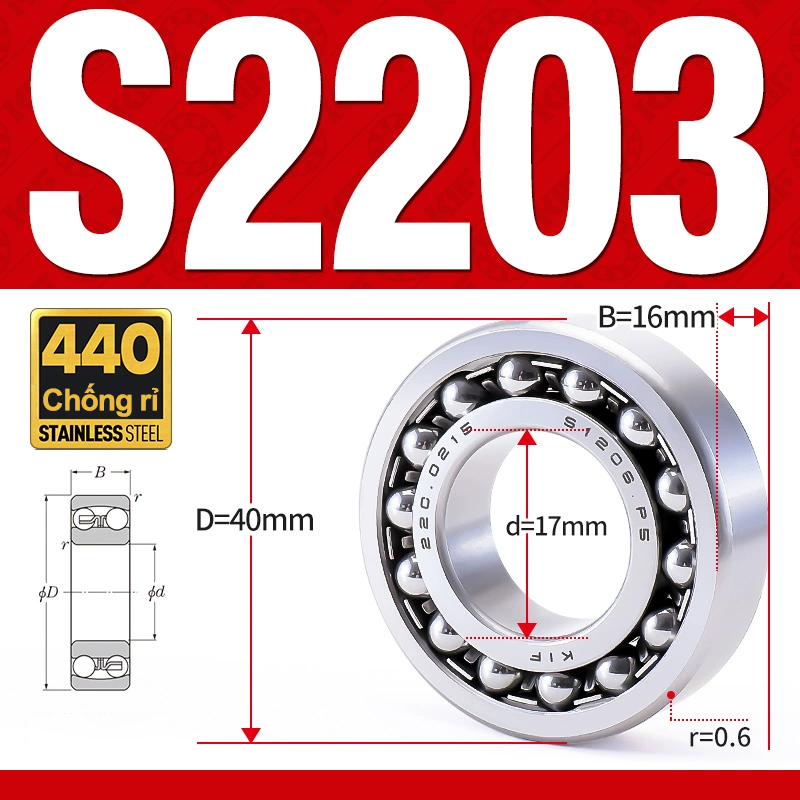 Vòng bi - bạc đạn tự lựa S2203 (Chống ăn mòn - Inox 404C - 17*40*16 mm)