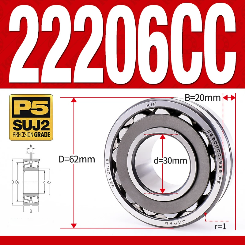 Vòng bi cà na tự lựa 2 dãy – bạc đạn cà na 22206CC/W33 (Có rãnh bôi trơn – lồng cách bi Thép – kt 30*62*20 mm)