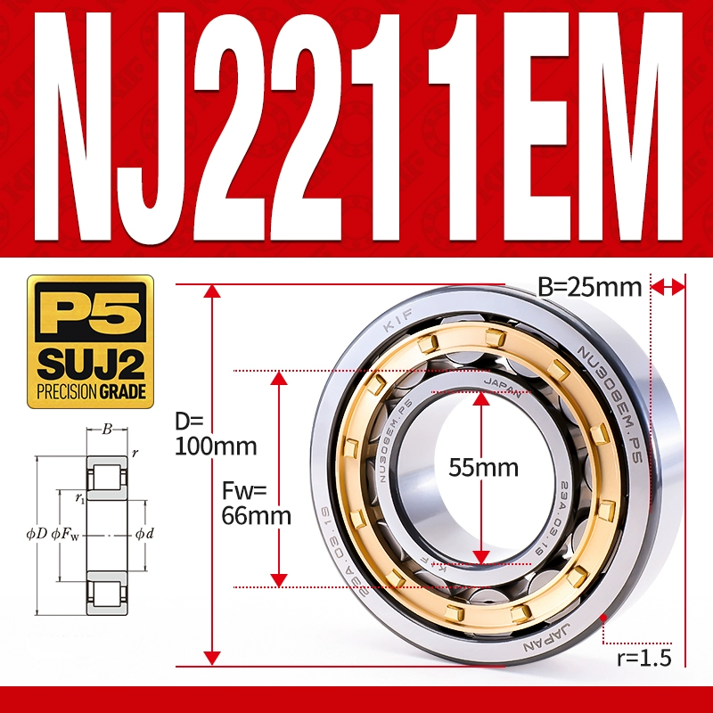 Vòng bi đũa – bạc đạn đũa trụ NJ2212EM (Chặn trục 1 chiều – lồng cách bi Đồng – kt 60*110*28 mm)