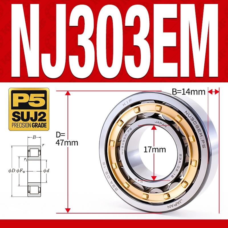 Vòng bi đũa – bạc đạn đũa trụ NJ303EM (Chặn trục 1 chiều – lồng cách bi Đồng – kt 7*47*14 mm)
