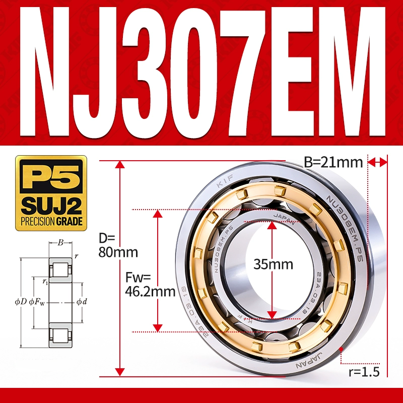 Vòng bi đũa – bạc đạn đũa trụ NJ307EM (Chặn trục 1 chiều – lồng cách bi Đồng – kt 35*80*21 mm)