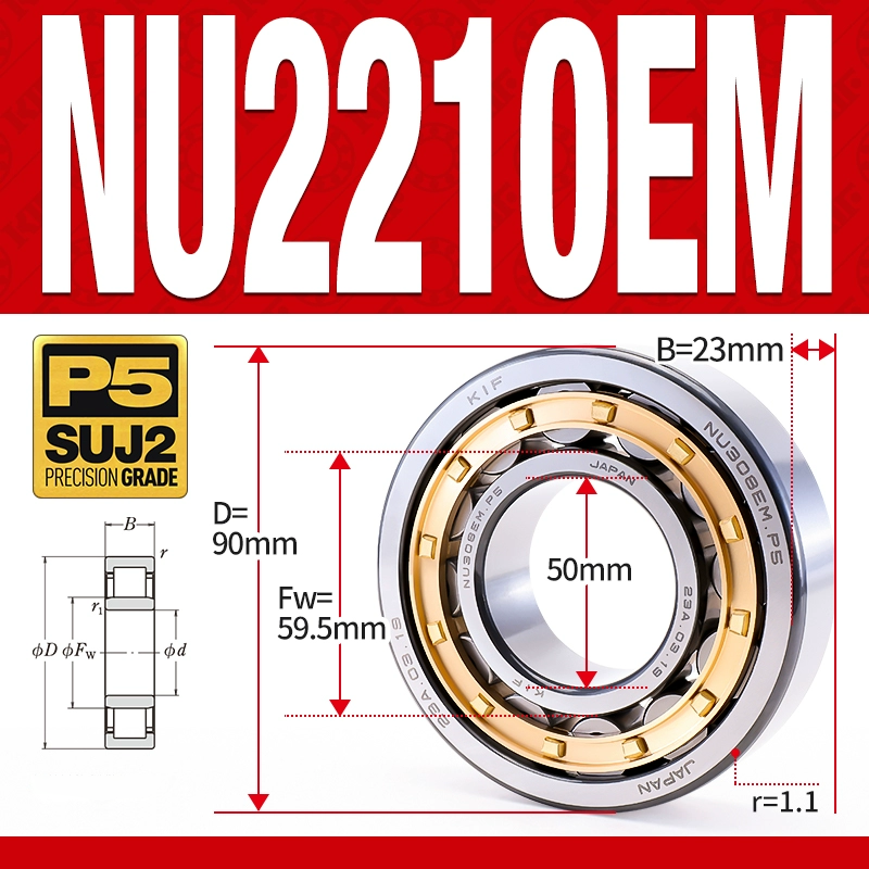 Vòng bi đũa – bạc đạn đũa trụ NU2210EM (Trục tự do – lồng cách bi Đồng – kt 50*90*23 mm)