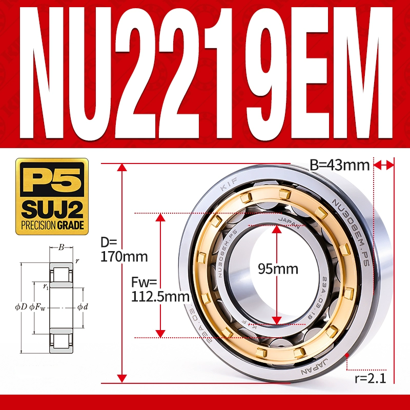 Vòng bi đũa – bạc đạn đũa trụ NU2219EM (Trục tự do – lồng cách bi Đồng – kt 95*170*43 mm)