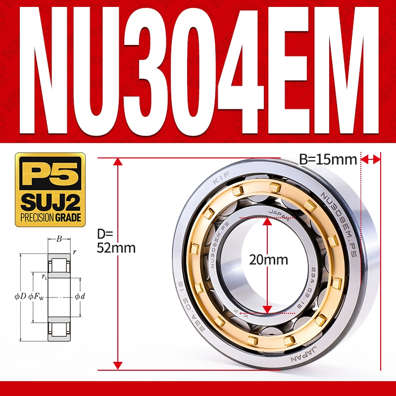 Vòng bi đũa – bạc đạn đũa trụ NU304EM (Trục tự do – lồng cách bi Đồng – kt 0*52*15 mm)