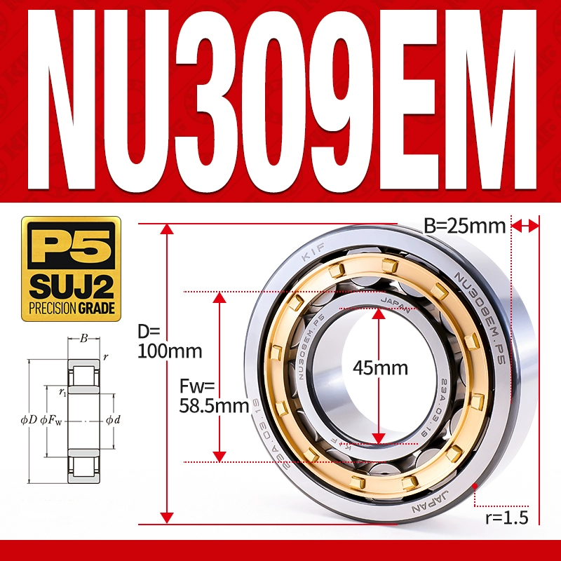 Vòng bi đũa – bạc đạn đũa trụ NU309EM (Trục tự do – lồng cách bi Đồng – kt 5*100*25 mm)