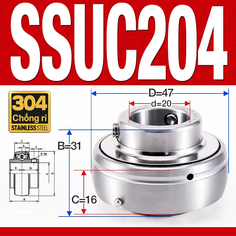 Vòng bi gối SSUC204 (Inox 304 – Đường kính trong 20 mm)