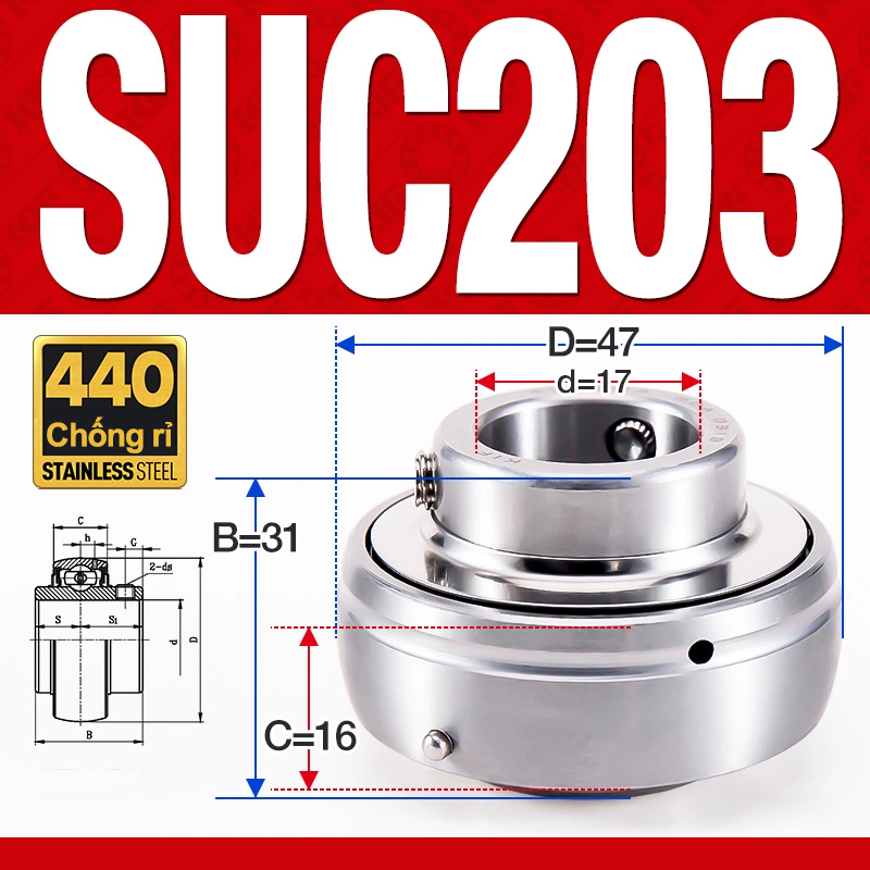Vòng bi gối SUC203 (Inox 440C - Đường kính trong 17 mm)