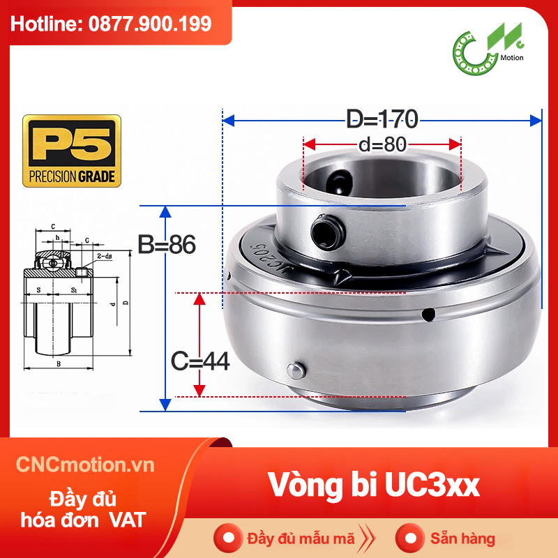 bao phủ dải mã bạn cung cấp: UCP201–220, UCP305–320, UCF203–208, UCF305–320, UCFC204–212, UCFL204–212, UCPA204–212, UCT204–212, UC204–220, UC305–320, SUCP204–215, SUCF204–215, SUCFL204–215, SUCT204–215, SUC201–210. Gửi mã/đường kính trục để CNC Motion đề xuất model, vật liệu và kiểu phớt phù hợp. Dòng 305–320 dùng thân lớn, gân tăng cứng – phù hợp tải nặng, xung lực. Ổ chèn UC dùng thay thế vào các vỏ P/F/FL/FC/T… hoặc lắp riêng theo thiết kế. Biến thể inox dùng thân & ổ chèn thép không gỉ, phớt phù hợp vệ sinh – thích hợp chế biến thực phẩm, dược phẩm, ngoài trời, môi trường ẩm/ăn mòn. Lưu ý: Kích thước lỗ bắt, bước lỗ, kích thước thân có thể khác giữa các hãng. Hãy gửi mã/ứng dụng để được đề xuất đúng model.Gối đỡ vòng bi UC & SUC | UCP • UCF • UCFL • UCFC • UCT • UCPA • UC | Dải mã 201–220 & 305–320 | Inox SUC-series | CNC Motion