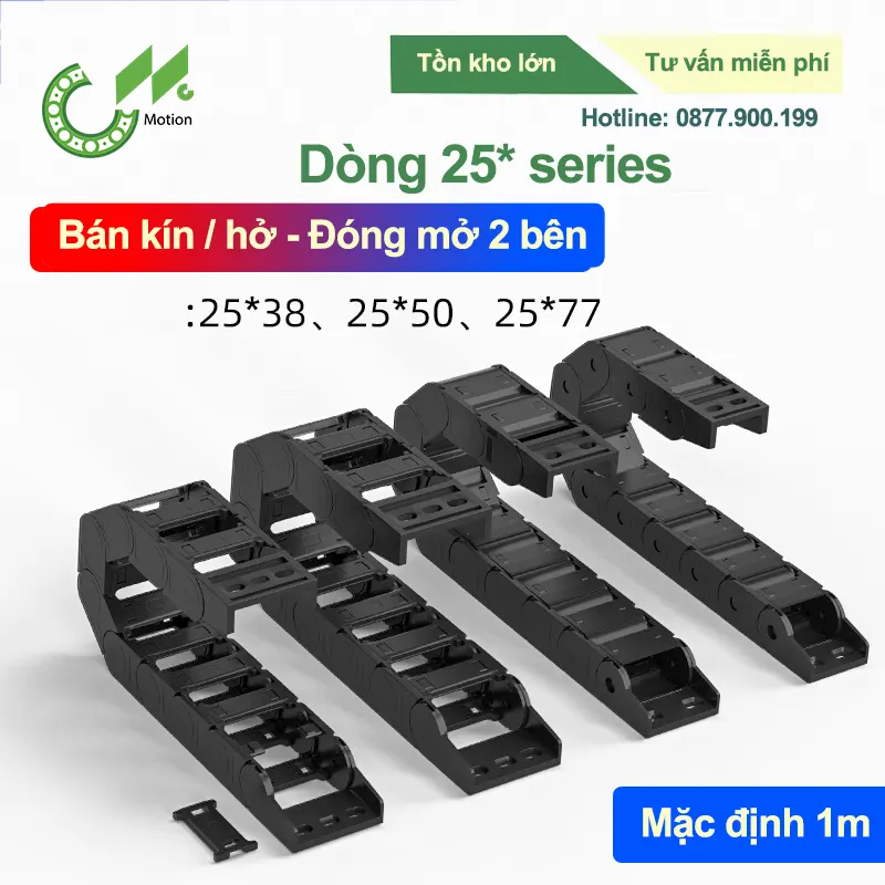 Website: cncmotion.vn • Hỗ trợ kỹ thuật & báo giá nhanh. Xích nhựa cầu (cable carrier/energy chain) dẫn hướng và bảo vệ cáp điện/ống khí/ống thủy lực trong chuyển động. Dải series 5*–65* bao phủ hầu hết ứng dụng: máy CNC, robot, băng tải đến cẩu trục hành trình dài. Lưu ý: ở nhiều hãng, số series thường gần với chiều cao hữu dụng bên trong (mm). Hãy đối chiếu chiều cao/chiều rộng/bán kính uốn trong catalog thực tế trước khi đặt hàng. *R nên theo khuyến nghị loại cáp: điện ≥10ר; tín hiệu/servo ≥12ר; thủy lực ≥15ר.