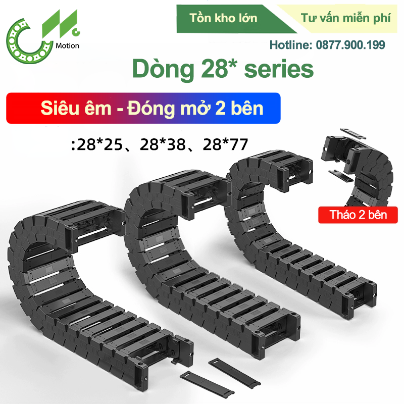 Website: cncmotion.vn • Hỗ trợ kỹ thuật & báo giá nhanh. Xích nhựa cầu (cable carrier/energy chain) dẫn hướng và bảo vệ cáp điện/ống khí/ống thủy lực trong chuyển động. Dải series 5*–65* bao phủ hầu hết ứng dụng: máy CNC, robot, băng tải đến cẩu trục hành trình dài. Lưu ý: ở nhiều hãng, số series thường gần với chiều cao hữu dụng bên trong (mm). Hãy đối chiếu chiều cao/chiều rộng/bán kính uốn trong catalog thực tế trước khi đặt hàng. *R nên theo khuyến nghị loại cáp: điện ≥10ר; tín hiệu/servo ≥12ר; thủy lực ≥15ר.