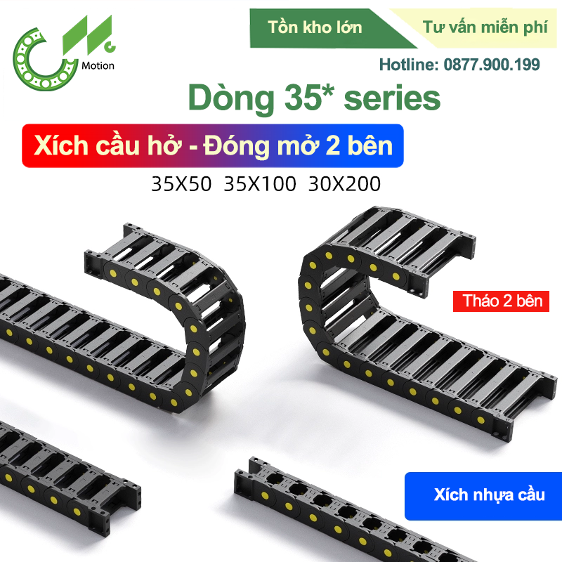 Website: cncmotion.vn • Hỗ trợ kỹ thuật & báo giá nhanh. Xích nhựa cầu (cable carrier/energy chain) dẫn hướng và bảo vệ cáp điện/ống khí/ống thủy lực trong chuyển động. Dải series 5*–65* bao phủ hầu hết ứng dụng: máy CNC, robot, băng tải đến cẩu trục hành trình dài. Lưu ý: ở nhiều hãng, số series thường gần với chiều cao hữu dụng bên trong (mm). Hãy đối chiếu chiều cao/chiều rộng/bán kính uốn trong catalog thực tế trước khi đặt hàng. *R nên theo khuyến nghị loại cáp: điện ≥10ר; tín hiệu/servo ≥12ר; thủy lực ≥15ר.