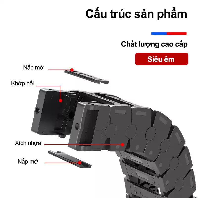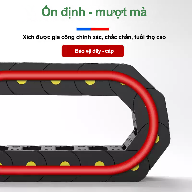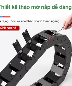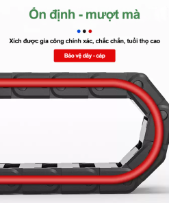 Xích nhựa cầu series 5*–65* bảo vệ và dẫn hướng cáp/ống cho CNC, robot, băng tải, cẩu trục.