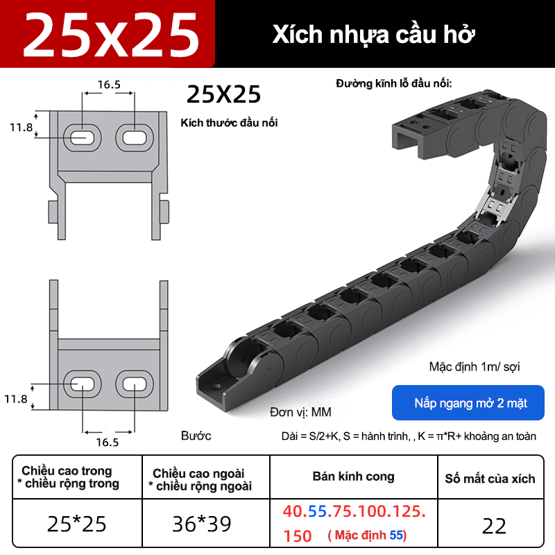 Tỷ lệ lấp đầy khoang khuyến nghị ≤ ~60% để cáp “thở”. Hãy thay dấu “*” bằng số thực tế từng hãng và bổ sung H×W×R, bước mắt xích, tốc độ/gia tốc tối đa theo catalog.Xích nhựa cầu series 5*–65*: nắp kín – nắp hở – tĩnh âm