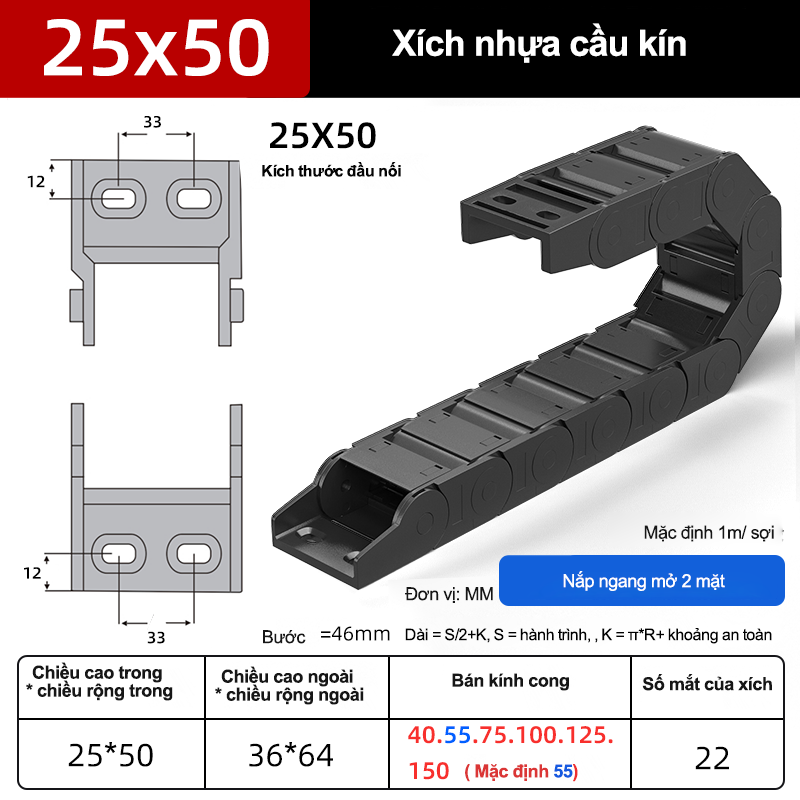 Tỷ lệ lấp đầy khoang khuyến nghị ≤ ~60% để cáp “thở”. Hãy thay dấu “*” bằng số thực tế từng hãng và bổ sung H×W×R, bước mắt xích, tốc độ/gia tốc tối đa theo catalog.Xích nhựa cầu series 5*–65*: nắp kín – nắp hở – tĩnh âm