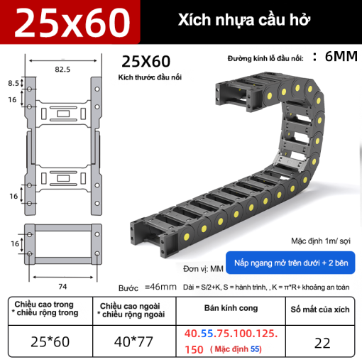 Xích nhựa cầu nắp hở XN25x60 CA ( Kích thước trong 25x60mm )