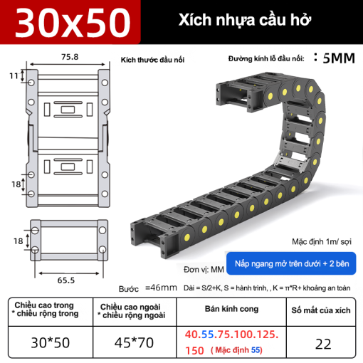 Xích nhựa cầu series 5*–65* bảo vệ và dẫn hướng cáp/ống cho CNC, robot, băng tải, cẩu trục.