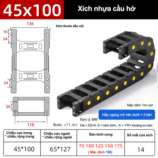 Xích nhựa cầu nắp hở XN45X100 CA NH ( Kích thước trong 45X10mm )