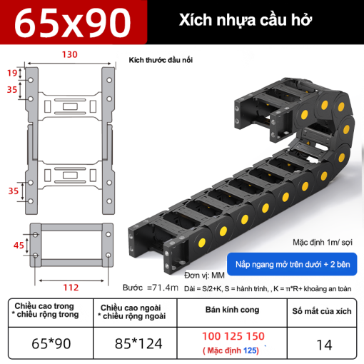 Tỷ lệ lấp đầy khoang khuyến nghị ≤ ~60% để cáp “thở”. Hãy thay dấu “*” bằng số thực tế từng hãng và bổ sung H×W×R, bước mắt xích, tốc độ/gia tốc tối đa theo catalog.Xích nhựa cầu series 5*–65*: nắp kín – nắp hở – tĩnh âm
