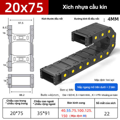 Xích nhựa cầu nắp kín XN20x75 CA NK ( Kích thước trong 20x75mm )
