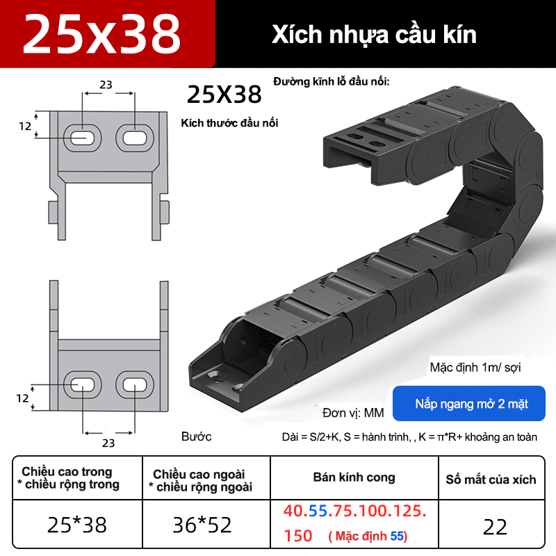 Tỷ lệ lấp đầy khoang khuyến nghị ≤ ~60% để cáp “thở”. Hãy thay dấu “*” bằng số thực tế từng hãng và bổ sung H×W×R, bước mắt xích, tốc độ/gia tốc tối đa theo catalog.Xích nhựa cầu series 5*–65*: nắp kín – nắp hở – tĩnh âm