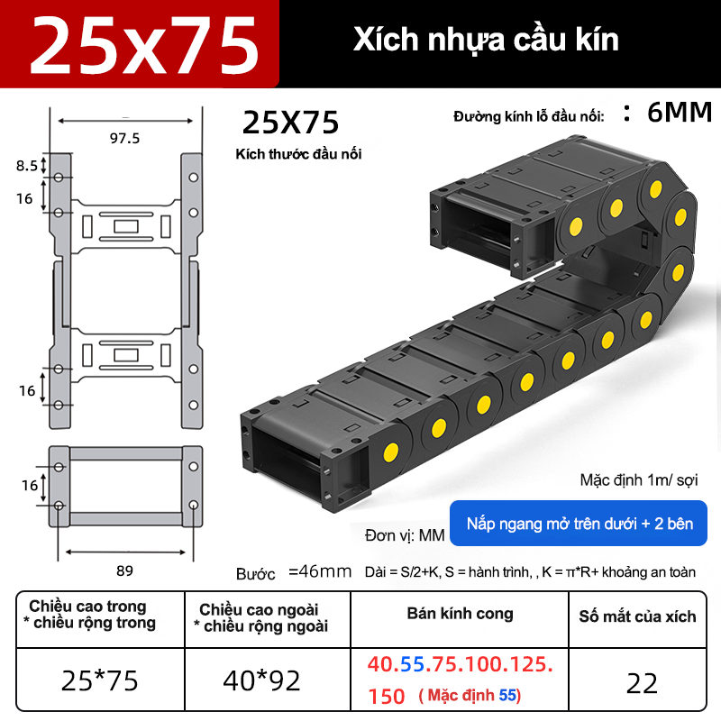 Tỷ lệ lấp đầy khoang khuyến nghị ≤ ~60% để cáp “thở”. Hãy thay dấu “*” bằng số thực tế từng hãng và bổ sung H×W×R, bước mắt xích, tốc độ/gia tốc tối đa theo catalog.Xích nhựa cầu series 5*–65*: nắp kín – nắp hở – tĩnh âm