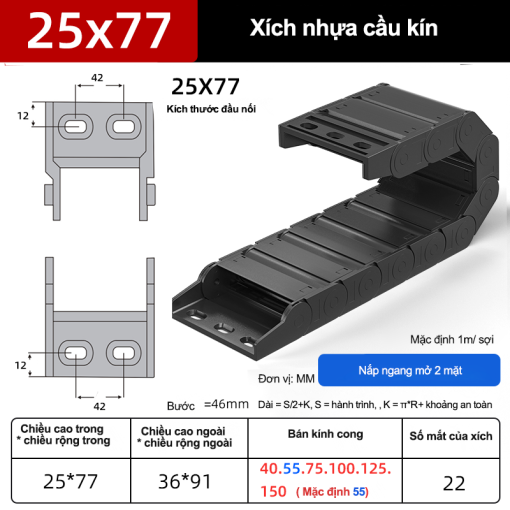 Tỷ lệ lấp đầy khoang khuyến nghị ≤ ~60% để cáp “thở”. Hãy thay dấu “*” bằng số thực tế từng hãng và bổ sung H×W×R, bước mắt xích, tốc độ/gia tốc tối đa theo catalog.Xích nhựa cầu series 5*–65*: nắp kín – nắp hở – tĩnh âm