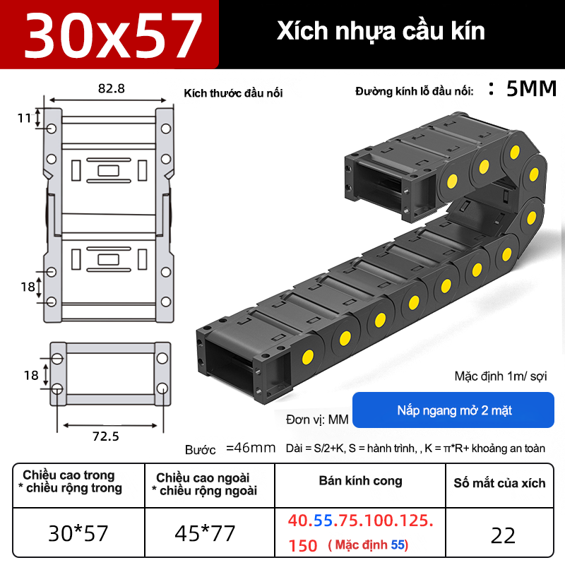 Tỷ lệ lấp đầy khoang khuyến nghị ≤ ~60% để cáp “thở”. Hãy thay dấu “*” bằng số thực tế từng hãng và bổ sung H×W×R, bước mắt xích, tốc độ/gia tốc tối đa theo catalog.Xích nhựa cầu series 5*–65*: nắp kín – nắp hở – tĩnh âm